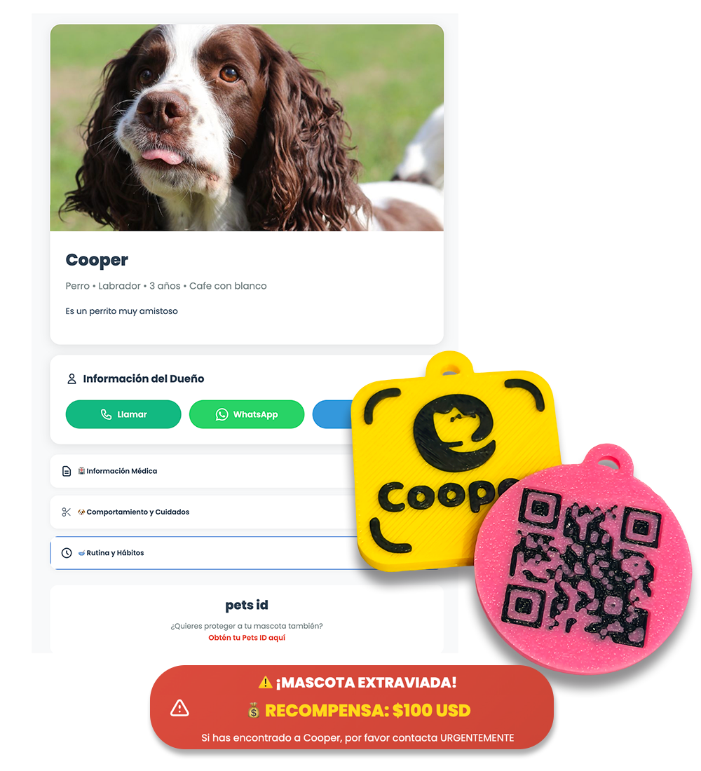 Un simple escaneo y quien encuentre a tu mascota podrá contactarte de inmediato. Cada placa tiene un código QR único vinculado a una página web con foto, nombre, datos de contacto y botones directos para llamarte o escribirte por WhatsApp. Si tu mascota se pierde, activa el “Botón de Pánico” desde tu dashboard y la página mostrará una alerta y en caso que lo desees un monto a pagar como recompensa.