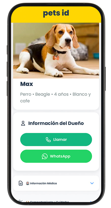Cualquier persona que encuentre a tu mascota puede escanear el QR de la placa y contactarte de inmediato vía llamada, WhatsApp o email.